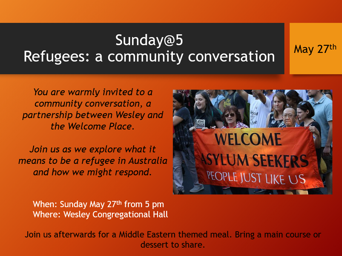 Sunday@5 - Refugees: a Community Conversation Sunday, May 27, 2018 5:00 PM 8:00 PM 17:00 20:00 Wesley Uniting Church, Geelong 100 Yarra Street Geelong, VIC, 3220 Australia (map) Google Calendar ICS